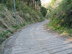 やがて切通道は向方配水池という施設のところから右手に折れて坂を下って行きます。その付近から嶽之下神社辺りまでは坂の傾斜は一段ときつくなり、蛇行をしながら下って行きます。切通の両側の壁は高く、壁の傾斜も大変急になっていて、切通壁の上には簡単には上れないようです。(切通壁に上ろうと考えるのは私ぐらいか?) この辺りの切通は古道という雰囲気は全くありません。近年にこの付近の切通道は現在のように整備されたものと思われます。 |