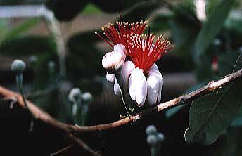 フェイジョアの白い花の中央部から赤い雄しべは束になって直立している姿は植物園の温室