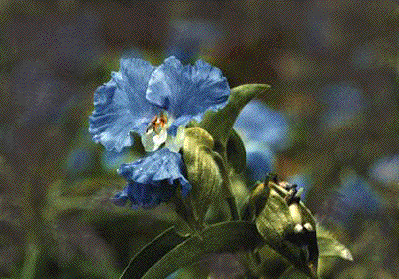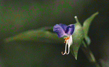 近寄ってよくよく花を眺めると、青色の花びらにはさまれて、黄色の雄蕊がくるくると巻いている姿、なんとのいえないほどの可憐さとこっけいさがあります。 それだけにツユクサは淋しい花で「露の命」のようにはかなさを花の中に秘めた植物として多くの文学作品の中で扱われています。