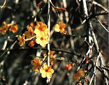 の色は迎春花の名のごとく、黒く濡れた木曽路に春を輝かしていました。