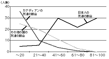 Q:日本人、カナディアンの友達の割合は? (日本人、カナディアン、その他の国の人の合計を100%とし、それぞれの割合がどれくらいかを答えてもらいました。)