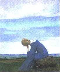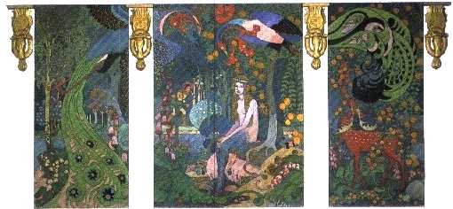 第一の部屋には彼が青春時代を過ごしたドイツはブレーメン郊外の芸術村、ヴォルプスベーデ時代の大小の油絵が飾ってあります。イラストからの印象で、あまりオーソドックスな絵を描くとは思わなかったので驚きました。タッチはかなり荒っぽく、ディバイディズム、特にセガンティーニを連想させます。しかし、色彩の鮮やかさ、デッサンの確かさ、匂うようなロマンチシズム、という要素はユーゲント・シュティルの代表的な画家の一人という評価を実証しています。リアリズムで描かれた作品と、モザイク的な装飾的な絵と、それぞれがなかなかにレベルの高いものに仕上がっています。