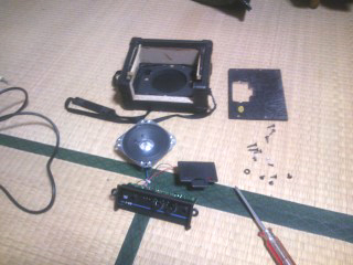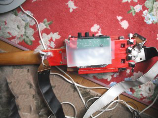 メカ部分といっても本体は出来あいのものなので周囲を切り取る作業があるだけだった。とはいえ、ピックアップを直接基盤につなぐ作業は難しい。 最初は常識的に左写真のように繋いだが音が出なかった。 |