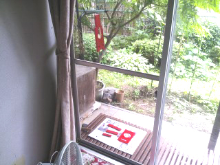6月23日、先月乗った水陸両用バス「スカイダック」に続き、今日はオープントップの鳩バスに乗る予定。 出かける前にモバイルギターのボディを塗装した。本体をつるし、天板・ブリッジ板と側板を濡れ縁に並べる。手塗りで5分とかからない作業。3号機ミニと同じ赤じゃ面白くない?でも勿体ないし・・・ |