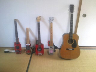 自作モバイルギター四台。 左から4号、3号ミニ、2号、1号。(右は比較のための生ギター) 1号で我慢すればいいのに欲張った2号がヘビーに、さらに欲張ったミニはカッコだけ。4号でようやく落ち着きそう。(でももう5号のアイデア考えてる) |