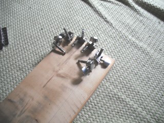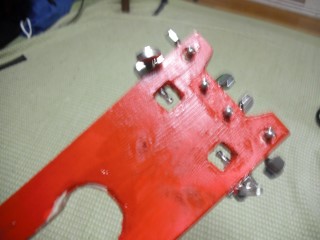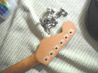 当面使うのはネックとブリッジだけだ。ネックはさらにペグを外す。 ペグはフルメタルタイプで重い。ガッチリしているように見えるが回してみると精度に難があるように感じた。まあ、このくらいは仕方がない。 |