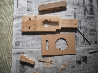 | ボディと表板に引いたラインにそってドリルで穴を開け、糸鋸で切っていく。今回も百円ショップで購入した細くて使いやすい鋸を使った。こういう作業は道具の良しあしが物をいう。 | ||||