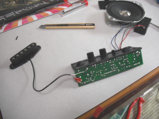 アンプ基盤を側板上部にネジ止めして組み込み終了。 スピーカの磁石部分とバッテリーの穴にはストラトの背面カバーを付ける予定。 |