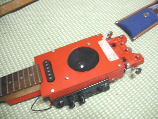 | アンプ内蔵の手作りギターを作り続けて四本目。一号はただ音が出るだけというお粗末なものでした。二号はライブでも使えるもっとパワーのあるものを、という事で作成。さらにそれをを改造して出力15ワットの本格的モバイルギターにバージョンアップしました。しかしパワーの代わりに重さと大きさが予想外になり、モバイルギターという原点から離れてしまいました。 二号の失点を取り返そうとして作った三号ミニはペグ固定部分のヘッドをカットしてペグを裏側に回し、ネックも短くしたので確かに小さくなりました。しかし今度は構造的に欠陥が多く音的に使えないものになりました。三号で得たノウハウを使って、今度こそ実用的なモバイルギターにしよう、という決意で四号機作成に取り組みました。 |