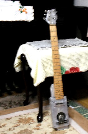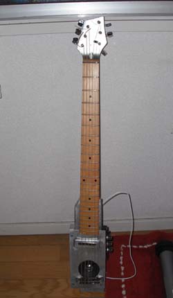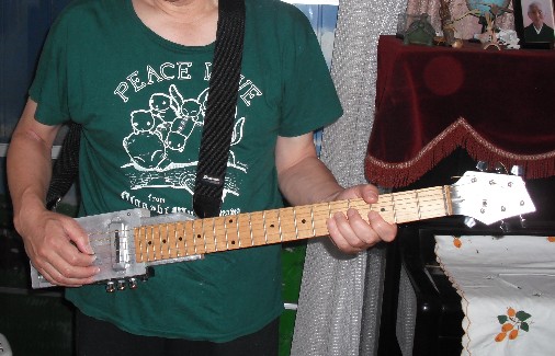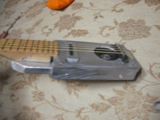 全体のバランスもスタインバーガーにスピーカをつけたような感じでなかなかいいです。まず思い出すのはボ・ディドリーが使っているようなシガーケース・ギターです。ギターを買えない黒人たちが葉巻ケースに穴を開けてネックを付け、ギターにしたというアレです。箱のサイズはかなり小さいですが、ネックに四角い箱が付いているイメージはシガーケース・ギターが一番近いようです。