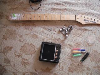これらの内蔵パーツをネックとボディの上に載せ、いろいろいじってみます。するといろいろなことが明確になりました。