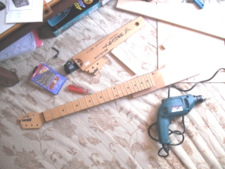 買って来たストラトタイプのネックからペグ(糸巻き)を外します。ここから作業が始まりました。単品売りのペグは一個1000円以上しますから、ペグが1セット付いたネックは考えようによってはすごく安上がりです。また指板は厳密な設計が必要なので素人には作成が難しいです。ネックにはボルトが入っていて反ったり狂いが出ないようになっていますが、これも作るとなると素人には面倒です。結局、ネックだけはプロが作ったものを流用するのが最も賢明だろうと思います。