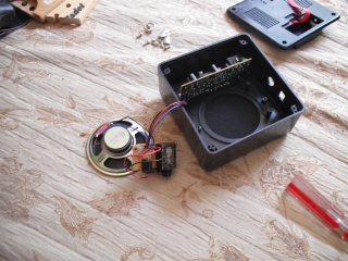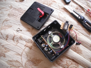 二つの穴があいたボディに内蔵部分を収納してみます。スピーカはすっぽり入り、電池と出力端子もうまく収まりました。バランスもなかなかいいようです。しかしアンプ基盤はうまくいきません。入力ソケットのカバーが四角く出っ張っていてボディに当たるのです。これを取り外そうとするのですが、金具が入っていて取れません。ニッパーとノコギリで切れ目を入れ、ラジオペンチで引きちぎるようにしてなんとか半分くらい取りました。全部取る必要は無いのですが、不細工です。まあ、見えないからどーでもいいか。