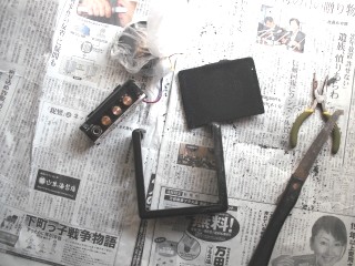 4:ピックアップの取り付け方に困る、ネジを付ける場所がない・・・アルミ缶を切ってケースを作り、ホッチキスで停めて解決