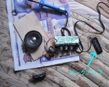 次にピックアップを取り付けます。写真は下にありますが、ケーブルを表板に通してからアルミ缶を切って作ったケースに入れ、ホッチキスで停めます。そして裏から出ているケーブルをアンプ基盤の入力部分にハンダ付けします。この作業が一番重要です。しかし狭い空間にゴリゴリ押し込むので何度もハンダが外れてしまい、その度に表板を開けて付け直しになりました。ケーブルもこすれて接続部分が切れてしまうことがありました。