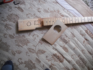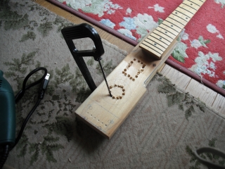 木部の工作にかかります。まず、ネックの先端を切断、一列のペグ穴を二列にしてサイズと重さを小さくします。この時使わない穴を切除するのに気持ちがいっていて、ペグを停めるネジ穴の位置を確認しなかったので、端っこのネジ穴まで切り落としてしまいました。ペグ位置をずらせば取り付けは可能ですが、ペグが回らなくなる可能性があります。しかし、デザイン的にはこの角度でないと決まらないので仕方のないところです。反対側には一応計算して穴をあけました。使ったのは電動ドリルと手持ち最大の6.5ミリドリル刃です。仮付けしてみるとおかしな並び方になりましたが、これはこれで面白いと思いました。