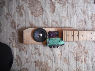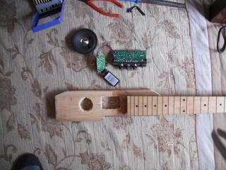 バッテリーと出力端子をボディ穴に押し込み、組み立てた表板を貼り付けます。するとほとんど完成です。この状態で持ってみるとすごく軽いのです。ほとんどウクレレ?