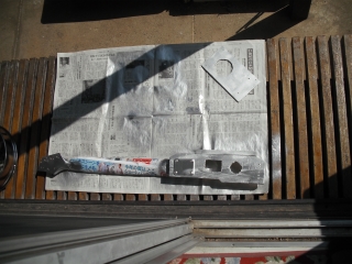 風が巻いていて、かぶり気味です。一回目は塗料が流れてしまったので新聞紙でふき取って修正しました。一応縦横斜めからまんべんなく吹き付けます。天気がよくて日差しが強いのであっという間に乾きます。どうせ本物ではないので、汚れが見えない程度に二回塗装して終了。この銀色スプレーも百円ショップで買ったもので、もう何度か使用しています。ペコペコのブリキ風でなかなかいい味を出しています。