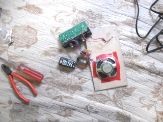 それからアンプ基盤をひっくり返し、入力プラグ部分をよく見ると、案外分かりやすくプラス・マイナスの入力部分が並んでいます。ここにピックアップからの黒線・赤線をハンダで仮付けします。プラス・マイナスの厳密な区分は無いはずですが、ちょっと不安です。そして電池ケーブルに9ボルト電池をつなぎ、ピックアップを金属で(ドライバーで)こすってみます。するとスピーカから「ゴリゴリッ!」という音が聞こえました。どうやらアンプも無事で、ピックアップにもうまく繋がっているようです。これで仕事はもう九分九厘終わったようなもので、あまりの簡単さにまたまた拍子抜けしてしまいました。