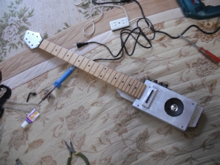 左がほぼ完成したギターです。この状態で適当にチューニングし、音を出してみます。ちょっとポコポコした響きですが、少なくともアコースティック並みの音量が出ています。これならモバイルギターとして実用になるレベルだと思います。苦労が報われてホッとするとともに、思い切り祝杯を挙げたい気分になりました。