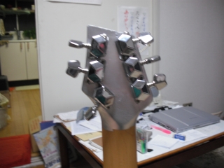 問題はいくつかあって、ピックアップの上下位置がずれていて、高音部がうまく入らない、さらにピックアップの取り付け高さがちょっと高めで弦高を下げられないというのが最大の問題のようです。それはまた調整するとして、とりあえずヘッドにペグを取り付け、ブリッジを入れて弦を張ります。