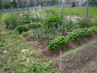 | 開墾の日々 玄米菜食を支えるのが自家製農作物です。 右は友人から借りている十畳ほどの農地「第一農場」です。ここからは大根・人参・ナス・キュウリ・トマト・キャベツなどを収穫しました。現在はジャガイモ・エンドウ豆・タマネギ・レタス・ブロッコリーなどが育っています。 完全無農薬なので虫との闘いは熾烈です。朝一番に来て手でひねりつぶすのが日課になりました。 |