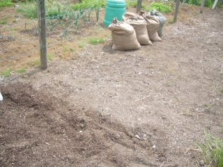 | 開墾途中の土地です。 袋はクリーンセンターから貰ってきた木材チップで、これを土と混ぜて農地にします。この袋は天気のいい時には20キロくらいですが、雨が降ると水を吸って一気に重くなります。これを抱えて運ぶのは大変です。 カローラワゴンの後部座席を倒して積むと、この袋が10個積めます。これで幅一間・長さ四間分の土がまかなえます。 |