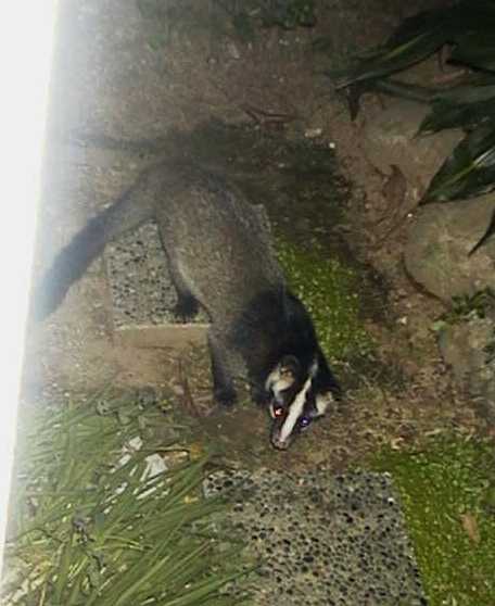 でも、ハナコウ(3匹目のまわり猫)がえさを食べながら、戸袋のかげに向かってフーッとうなるので、その方を覗くとアナグマが近寄っていました。デジカメを向けてシャッターを押すと、フラッシュの光とともに撮影することができました。