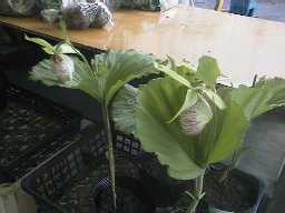 棡原長寿村センターには野草が売られています。熊谷草は不思議な形の花です。