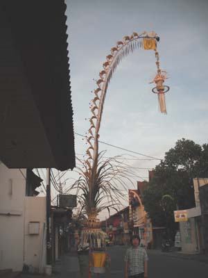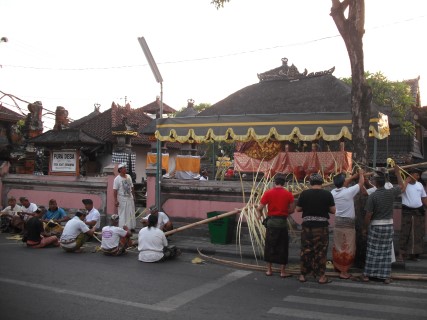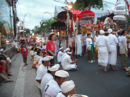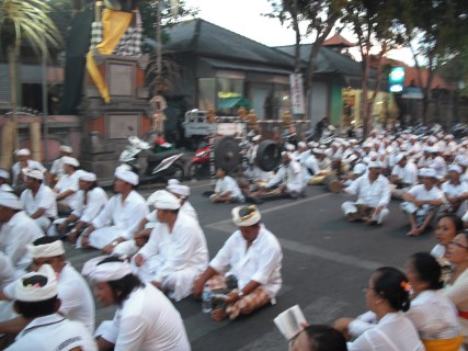 ウブドゥから戻りました。 夕暮れの散歩と買い出しに出ます。するとプラ・デサ寺院のお祭りが始まっていました。(上・プラ・デサとは町営とか国営という意味らしいです) 道路を占拠して、まるで座り込みデモです。(左) |