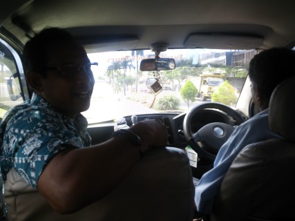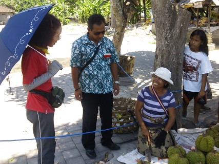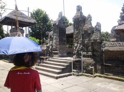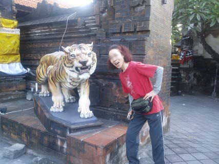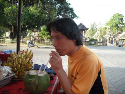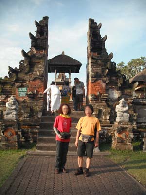 午後、二回目のツアーへ出発。今回はインドネシア語で「美しい寺」という意味の寺院を見学。たしかにシックで美しい。(左・下) 寺の駐車場でヤシの実を売っていたので一つ購入して飲む。(下・二段目)私はグアムで飲んだ経験があるけど、かみさんは初めてなのでした。 |