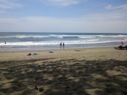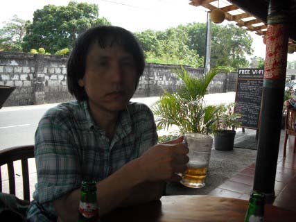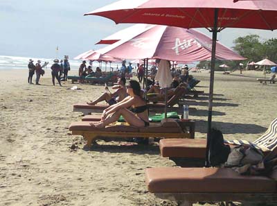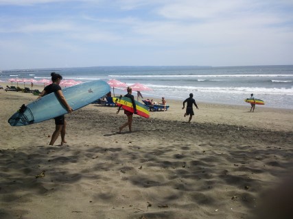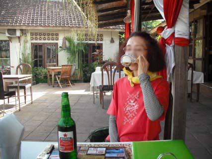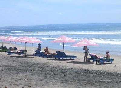 表通りがお祭りで封鎖されたので、回り道するためかホテルの裏の路地がバイクで埋まります。(上) 最終日、朝の食堂は外国人客で埋まっていました。(右) 朝の散歩で海まで歩きます。この日は大勢のサーファーがパイプラインを狙って海に繰り出していました。でもあまりうまい人はいなかったな。(下)私たちはパブやレストランでたくさんビンタンビールを飲みました。 |