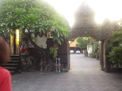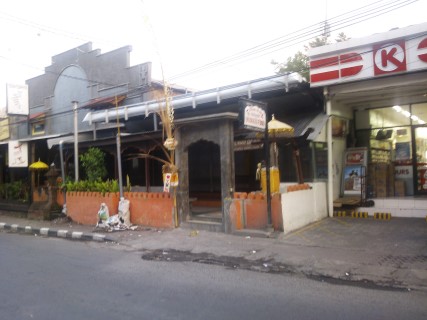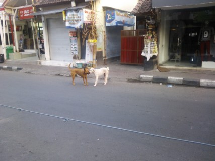 翌朝、現地時間7時に起きたはずが、時差を逆に計算していて本当は5時。かみさんに怒られる。 ホテルの真ん前にも荒れ果てた建物がある。その隣には商店が平然と営業している。これがバリ島だ。特徴的なのは野良犬がふらふら散歩していること。凶暴ではなく、町に溶け込んでいる。(右) |