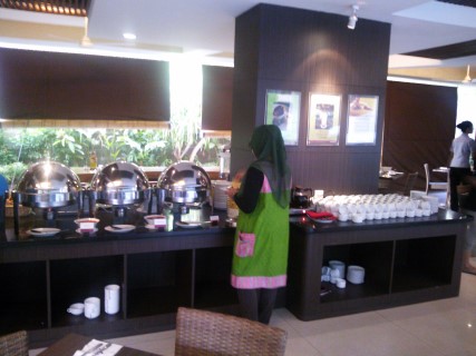スミニャック王宮に来る。玄関には二頭の虎が飾られている。(左上) いったん海まで行ってホテルに戻り、バイキング形式の朝食をとる。二人とも朝食は食べない習慣なのだが、この日はコーヒーを飲み、トーストを食べた。 |