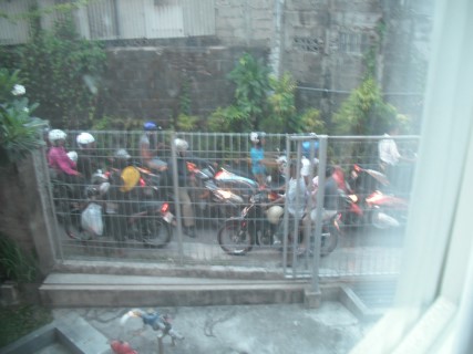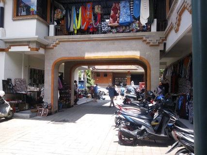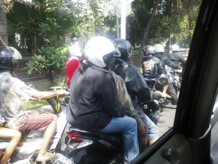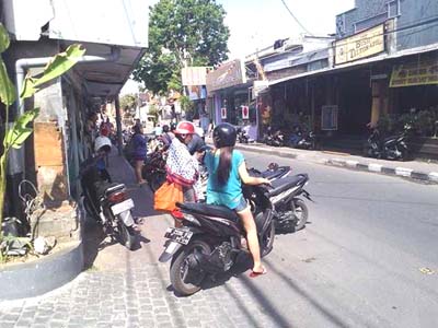 9時になるとガイドが迎えに来て一回目のオプショナル・ツアーに出発。ワンボックスカーでウブドゥへ。 道路のほとんどにバイクが駐車しており、歩道の上にも。乗っているのは女の子が多い気がする。小柄な女性が大男を後ろに乗せて走っているのをよく見た。(左) |