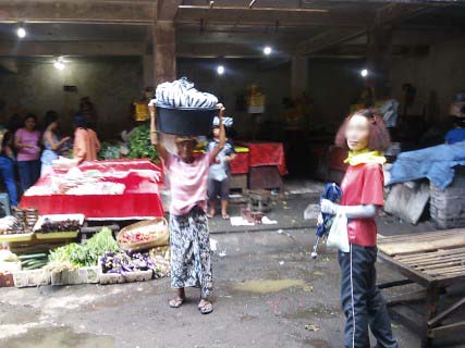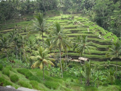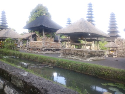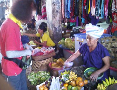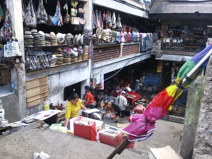 おは。バリもまだ暗いです。 デンパサールを抜けてハイウェイに入ると少し混雑はゆるむ。途中、寺院によった。(左上) ウブドゥはどこまでも観光土産の町で、ちょっと呆れた。そのはずれに棚田があり、観覧は有料。でもイメージとは違う小規模なものだった。(上) そのあと、市場へ寄った。(左) |