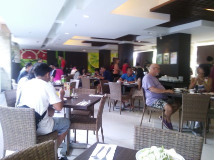 上はツアーガイドのHPにあったホテルの写真。 ウエルカムドリンクと花飾りを貰った。ロビーの片隅のテーブルで飲む。 |