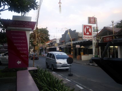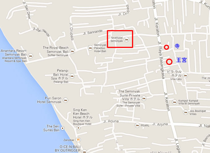 飛行場から南北に走るスミニャック通りを北上し、左に入ると宿泊先「フェイブホテル・スミニャック」があります。この通りをもっと進むと海があり、スミニャック通りを南下すると「プラ・デサ寺院」と「スミニャック王宮」があります。さらにその先にスーパーや郵便局があります。 |