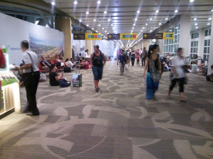 夕暮れ迫るングラ・ライ国際空港 に着陸。(左上) むっとする暑さの中、バスでターミナルへ運ばれ、出口へ進むと大勢の旅行業者らしい男たちが群れを成していた。(上)