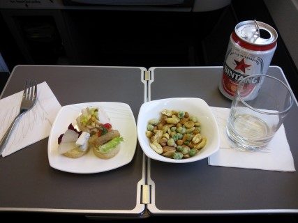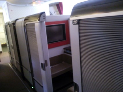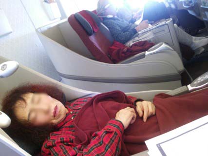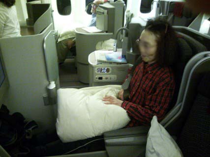 ビジネスクラスにしたのはかみさんが腰痛持ちで長い時間座っていられないからだが、お互いに寄る年波で横になって眠れるのは嬉しい。 行きの座席は「ほぼフラット」で、右の位置からズルズルと平らになる仕掛け。帰りは新型ジェットでフルフラットだった。 |