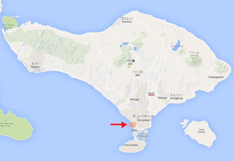 バリはそれほど大きな島ではありませんが、日程は三泊四日なのであまり奥地へは行けません。 南部中心市街地の一部スミニャック(上図矢印)のホテルとその周辺、それから郊外の史跡地ウブドゥへ行くことにしました。 |