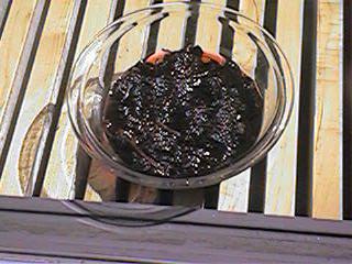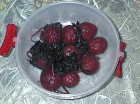 E紫蘇にひたるくらいの梅酢をかけます。(実に鮮やかな、奇麗な真紅に変わります)