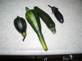 | 最初に採れたズッキーニ。 左から三本のうち、まともな形は三本目だけで、左の二本は育つ途中で花の方から腐り始めたのであわてて収穫したもの。右端はナス。 |