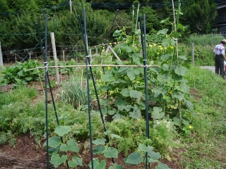 | 第一農園のキュウリはだいぶ大きくなった。二番目のキュウリ棚も育ち始めました。 ネギ、ニンジン、ナス、小松菜などはもう収穫できて、食卓を飾るようになりました。タマネギが甘く、生食でもとてもおいしかったのが驚きでした。 |