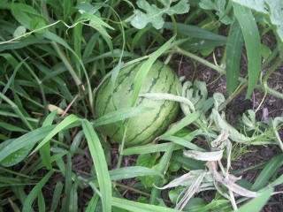 | 小玉西瓜がだんだん大きくなってきました。このくらいが食べごろかな?と思いますが、外からではなかなか分かりません。ツルの具合を見て、少し茶色くなってきたところで採集しました。 |