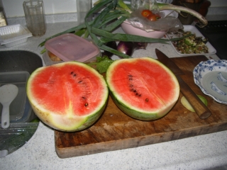 | 期待を込めてざっくり二つに切ってみると・・・ まずまずの赤さです。 種の具合からみるともう少し熟成させれば完璧だったようです。 塩を振ってかじりつくと、上品な甘さでした。 自分ちの畑で取れた西瓜を食べられるなんて、夢のようです。 |