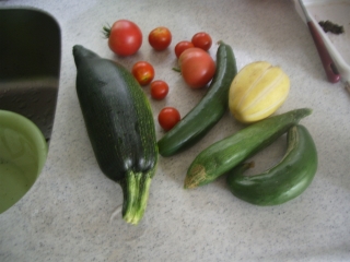 | 去年に引き続き、トマトもたくさん出来ました。 ミニトマトは植えていないのに、去年のこぼれ種からどんどん出てきます。近所や友人に配り、余った分はジュースにしました。 ズッキーニは後半になるにつれ巨大化しました。写真のものの倍くらいのものも出来ましたが、硬くなる傾向にあり味は落ちました。 マクワウリは小さいながら甘かったです。 他にゴーヤも数本採れました。 |