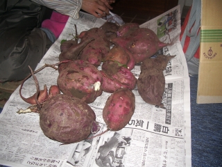 これが前日採集した大物たち。大きいのは赤ちゃんの頭くらいあります。 ただ、大きいのはミミズにほじられているのが多かったようです。 茂った芋のツルや葉っぱも茹でていためるとうまかったです。 芋は紫、黄色の二種類でしたが、黄色が圧倒的に甘かったです。かみさんは来年は黄色だけにしようと言っていました。 |