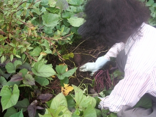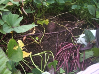 晩秋になり、期待のイモ類を収穫しました。 ツルが一面に茂ってどこに根があるのかわかりません。適当に掘り起こすとあちこちから飛び出してきます。宝探しのようです。 |