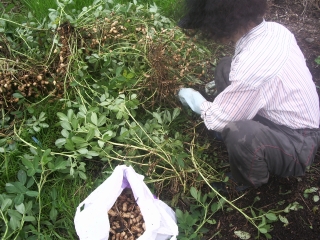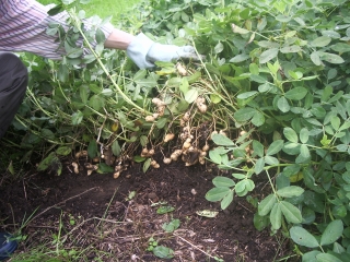 | ピーナッツの収穫も始めました。 写真のように、幹から落ちた花が地下に実をつけるという「落花生」です。 時期的にはちょっと早めだったようで、中の皮がまだ白いままのものが多かったようです。 |